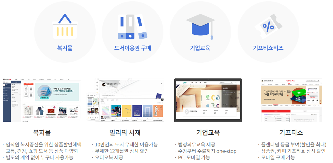 임직원 도서구매, 복지몰, 기업교육, 기프티쇼비즈 등 직원 복지서비스를 제공합니다.