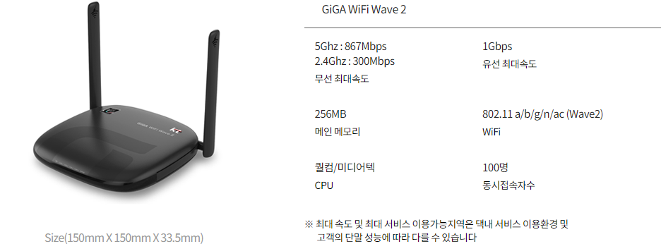 제공되는 WiFi공유기는 기가 와이파이 홈 ax 또는 기가 와이파이 웨이브2 입니다.